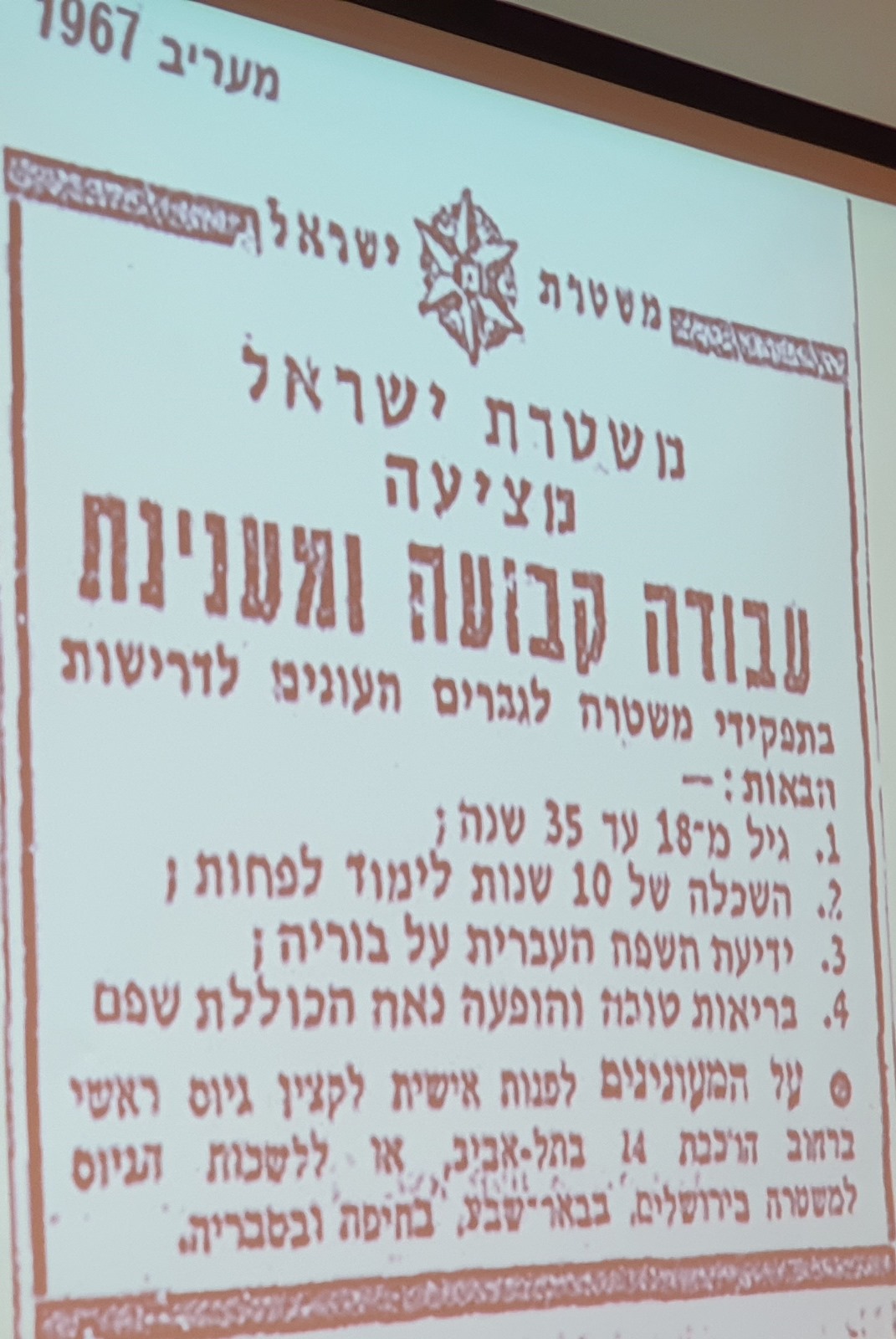 Todo empesa de este anunsyo para bushkar kandidates ke keren azerses polises en Israel. El anunsyo es de 1967. No se save si es antes de la gerra de sesh dias o dospues. Entre otras, esta eskrito ke estan bushkando: